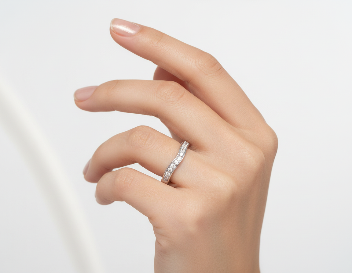 This graceful 2.5mm sterling silver band features an elegant curved soft flat profile adorned with twelve brilliant-cut diamonds (totaling 25 points) set in delicate pavé, creating a beautiful wave of continuous sparkle in a timeless eternity style.