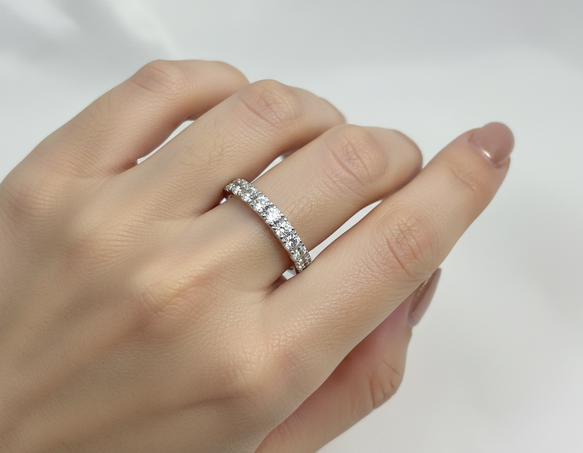This delicate 2.7mm sterling silver band features a refined soft flat profile with a gentle court shape inside, adorned with twelve brilliant-cut stones held in distinctive castle settings that elevate each stone around the entire circumference, creating a timeless eternity style with continuous sparkle.