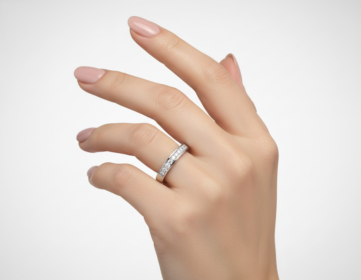 This delicate 2mm sterling silver band features a refined soft flat profile adorned with twelve brilliant-cut diamonds (totaling 20 points) set in elegant pavé, creating a continuous circle of sparkle in a timeless eternity style.