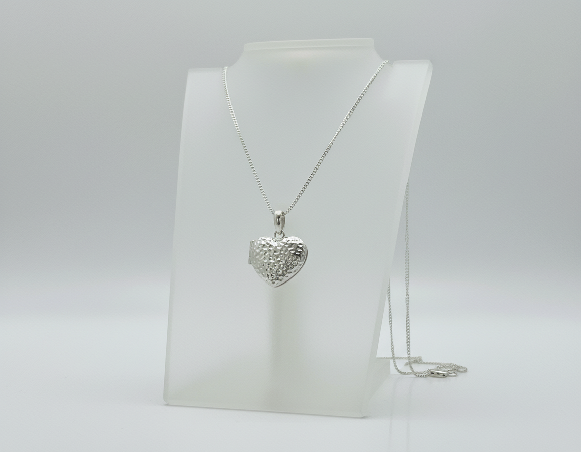This artisan 15mm heart-shaped sterling silver locket features a distinctive hand-hammered textured finish that creates beautiful light play and adds unique character to the surface, suspended from an adjustable 18-20 inch sterling silver chain that sits beautifully at any length.
