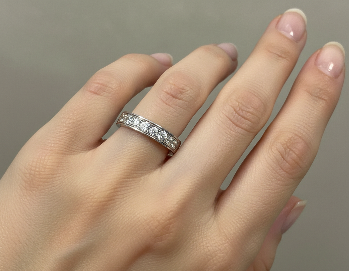 This elegant 4mm sterling silver band features a refined flat profile with a comfortable court interior, beautifully adorned with brilliant-cut stones in varying sizes set in a vintage-inspired pavé mill grain setting that adds delicate beaded edge detail and timeless charm.