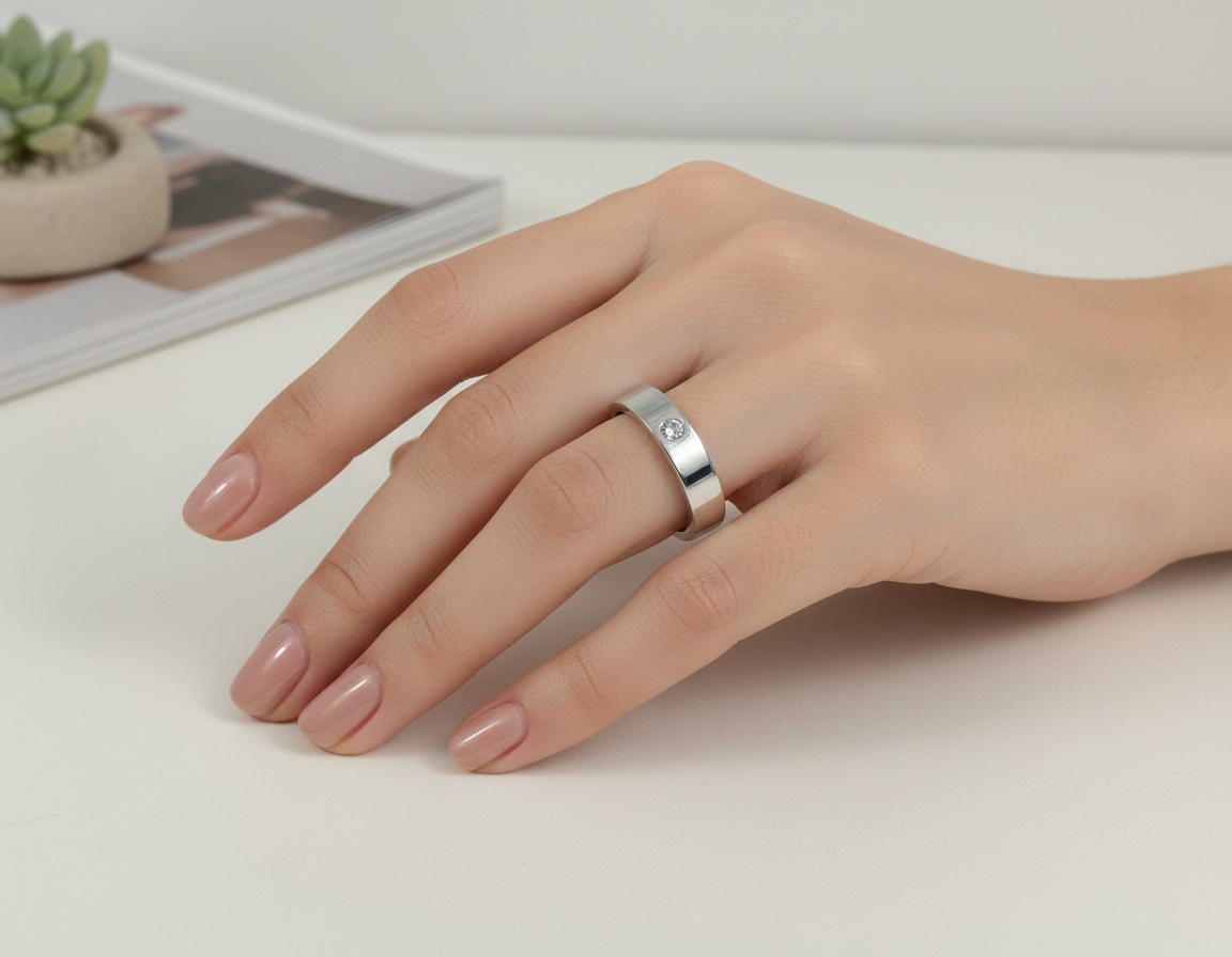 This elegant 5mm sterling silver band features a bold flat profile showcasing a 3mm brilliant-cut stone held securely in a protective rub-over setting that catches and reflects light beautifully, creating a striking focal point.