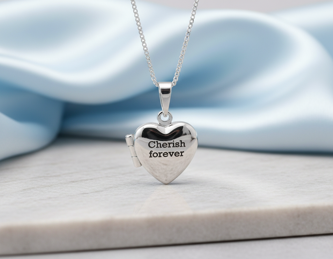 This delicate 15mm heart-shaped sterling silver locket features a classic design with "Cherish Forever" elegantly engraved on its polished surface, suspended from an adjustable 18-20 inch sterling silver chain that sits beautifully at any length.