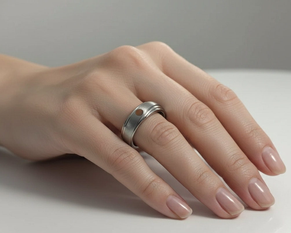 This contemporary 6mm titanium band features a comfortable D-shaped profile with a brushed finish that creates a modern, industrial aesthetic while remaining lightweight and incredibly durable for everyday wear.